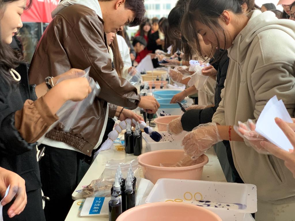 活动伊始,负责人向同学们详细介绍了扎染的历史、技法及特点,并示范了创作过程。随后在志愿者的指导下,同学们根据自己的喜好和创意,挑选颜色,通过纱、线、绳等工具,对织物进行扎、缝、缚、缀、夹等多种形式组合后染色,然后将其展开晾晒固色,最后变成一幅幅色彩斑斓、图案独特的扎染作品。由于参加的同学众多,一些没来及参与扎染的同学可以参与非遗问题问答,回答正确的同学可以参加套圈或投壶游戏,游戏获胜的同学可以领取相应的奖品。