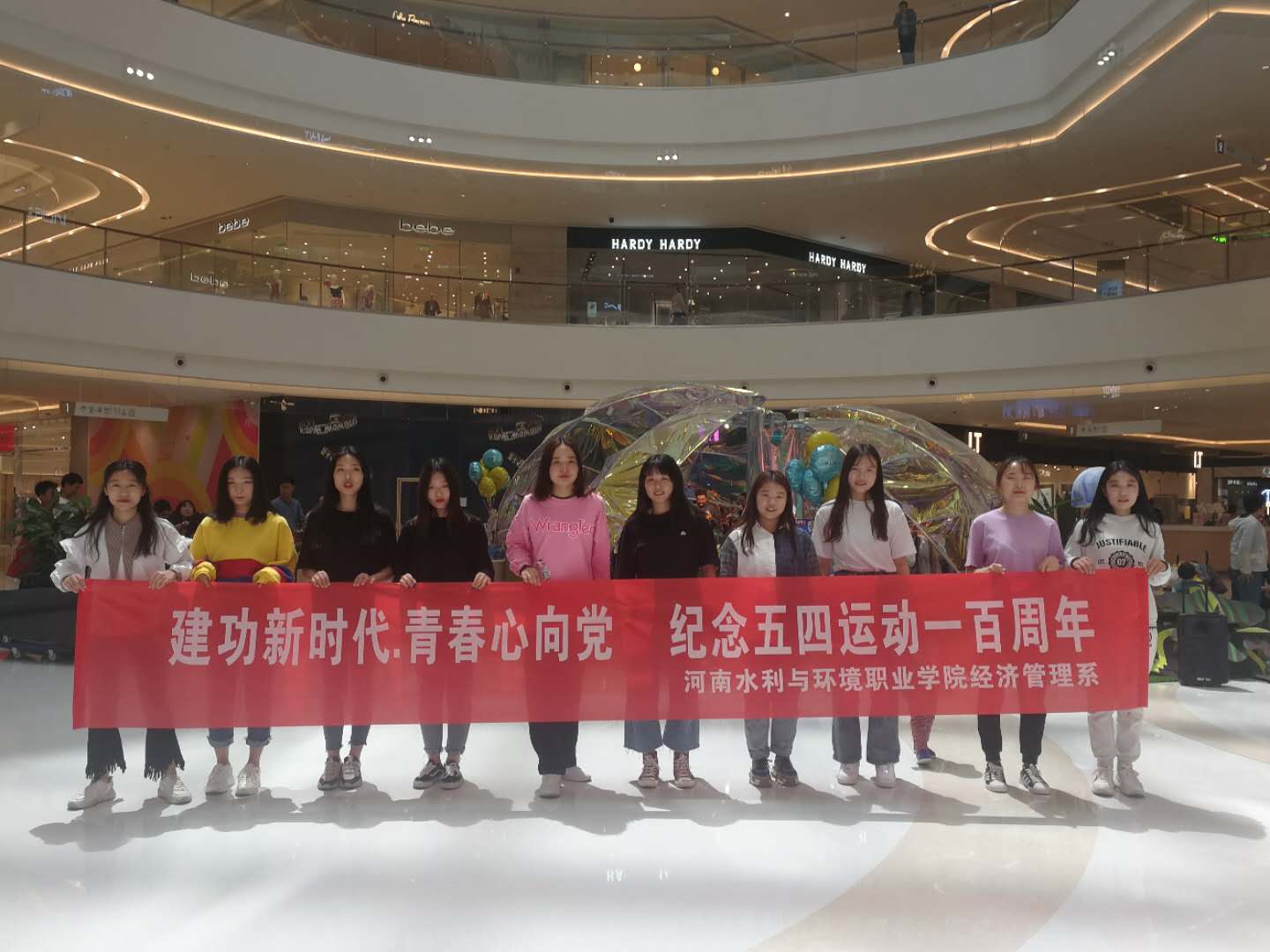 为了纪念五四运动一百周年,弘扬五四精神,让更多的青年了解五四,纪念五四,经济管理系在5月4日前后,分别在正弘城、校园内开展了纪念五四运动一百周年舞蹈“快闪活动”,并向围观观众发放了“青春心向党、建功新时代”五四纪念宣传页,让更多的青年人了解明白为什么要设立五四青年节运动、纪念五四运动,弘扬五四精神等内容。此活动具有很强的公益性,得到很多青年员工和朋友们的喜爱和支持。