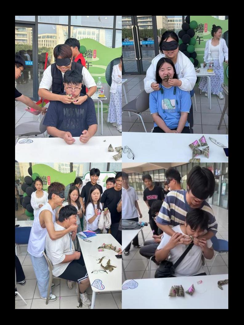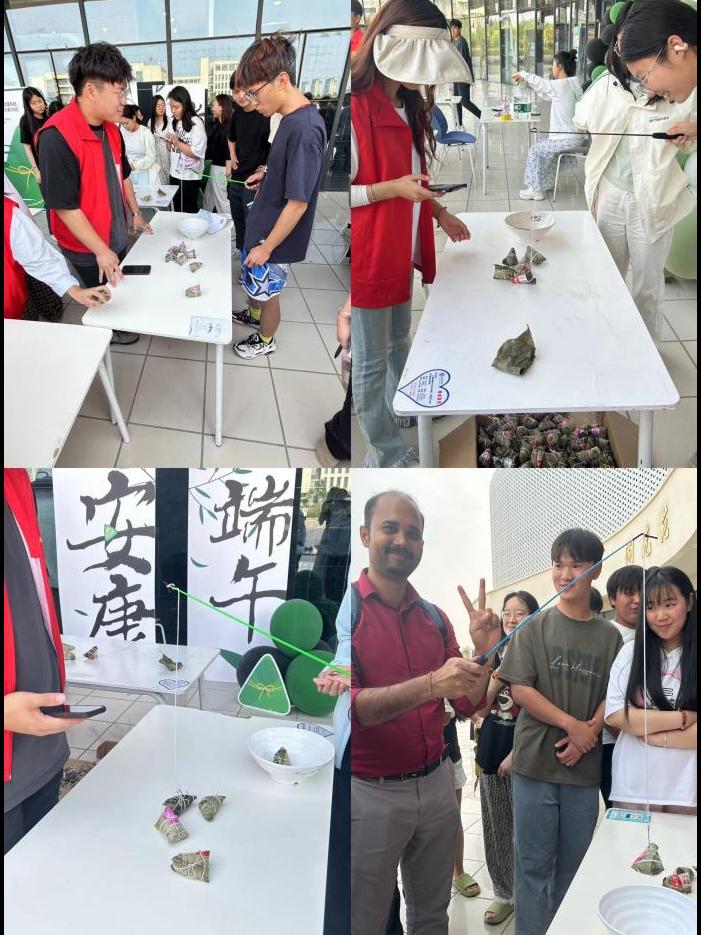 活动现场设置一分钟钓粽子、巧手夹粽子、蒙眼吃粽子三个小游戏。参赛者们签到后开始比拼。在一分钟钓粽子环节,志愿者事先准备了小鱼钩、粽子,参赛者们积极参与,现场气氛紧张而刺激。巧手夹粽子即又快又准地将小粽子模型夹到指定位置,考验了同学们的“筷子功”。最有趣的是蒙眼吃粽子,一位同学蒙着眼睛,在队友的指引剥粽子喂粽子,这一过程充满了欢笑和惊喜,将现场气氛推向了高潮。外教老师也加入同学们的队伍中,活动现场其乐融融,让大家对端午节传统节日有了更深入地了解。