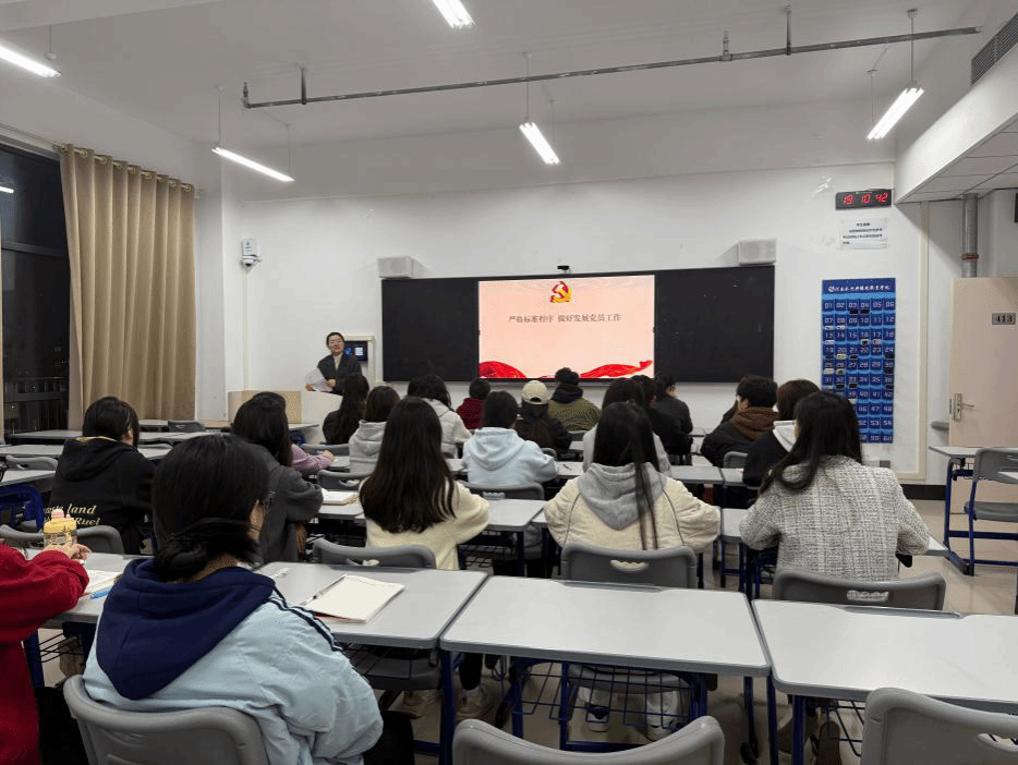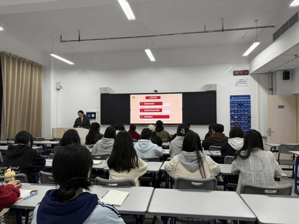 党课上,李佳颖围绕多方面讲解。她指出,党员发展是党建基础工程,须严格遵循流程,以政治标准为先,确保队伍纯洁先进。新时代党员要“四讲四有”,端正动机,摒弃功利,坚定为共产主义奋斗的信念。在意识形态领域,她强调要增强鉴别力,抵制错误观点。还以中欧班列为例,鼓励党员胸怀“国之大者”,坚定自信,立足岗位服务国家战略。互动环节中,同学们积极提问,就如何在实际生活中践行党员标准、平衡学业与党性修养等问题展开交流,现场气氛热烈。